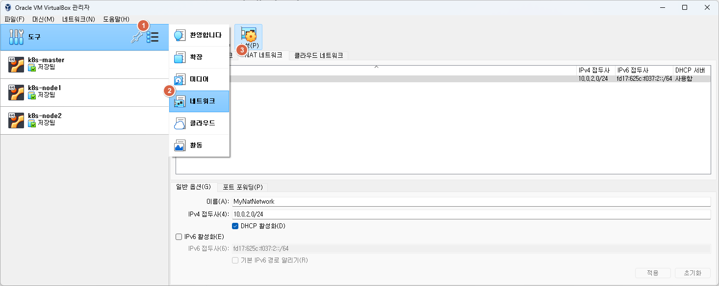 도구에서 네트워크를 선택하고 NAT Network탭을 선택해주세요