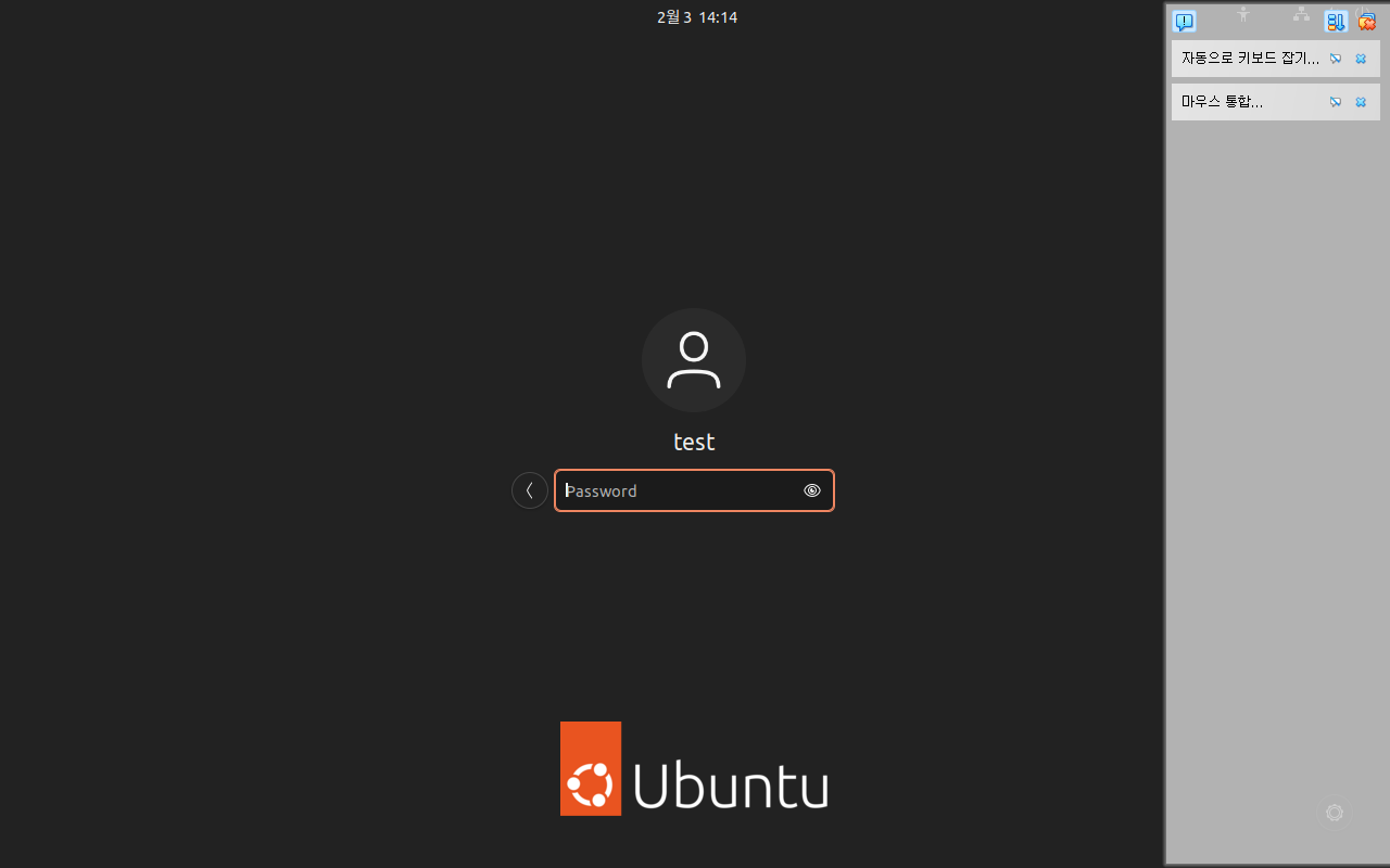로그인 창이 나오면 최초 우분투를 설치 할 때 넣어줬던 비밀번호를 입력해주시면 됩니다.