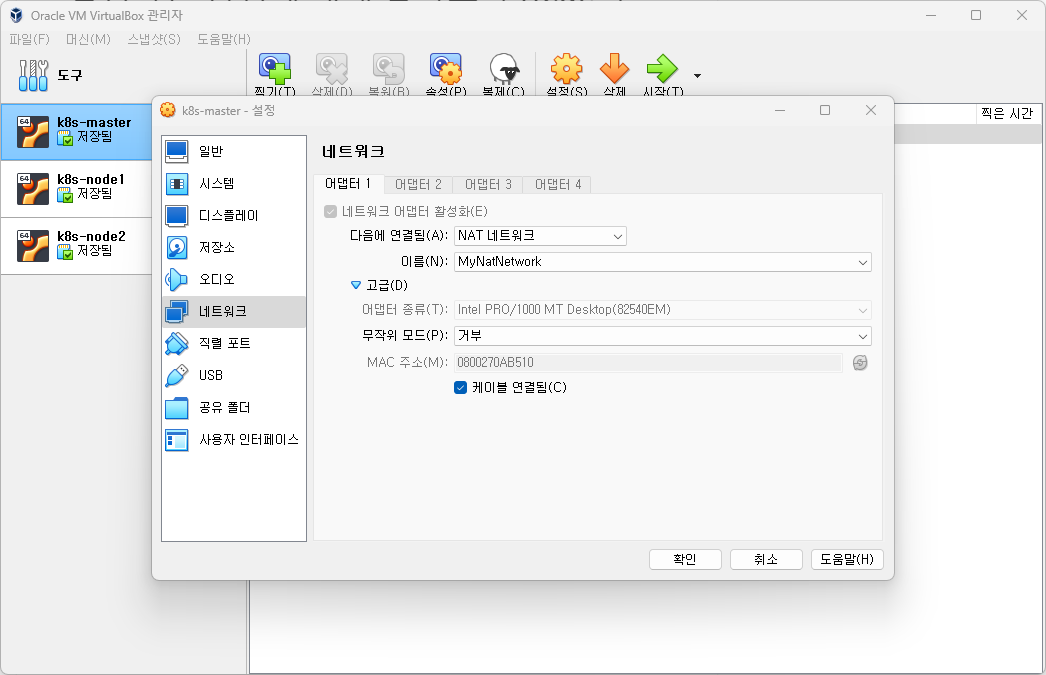 왼쪽 트리에서 VM을 선택하고 설정 버튼을 눌러서 어댑터1에 위에서 만든 Nat Network를 연결해줍시다.