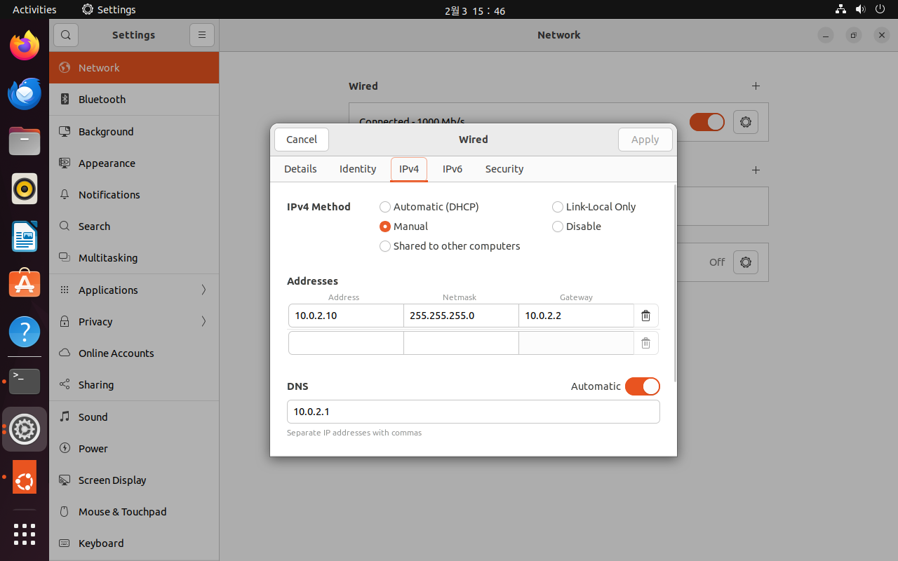 IPv4 탭에서 위 사진과 같이 설정해 줍니다.