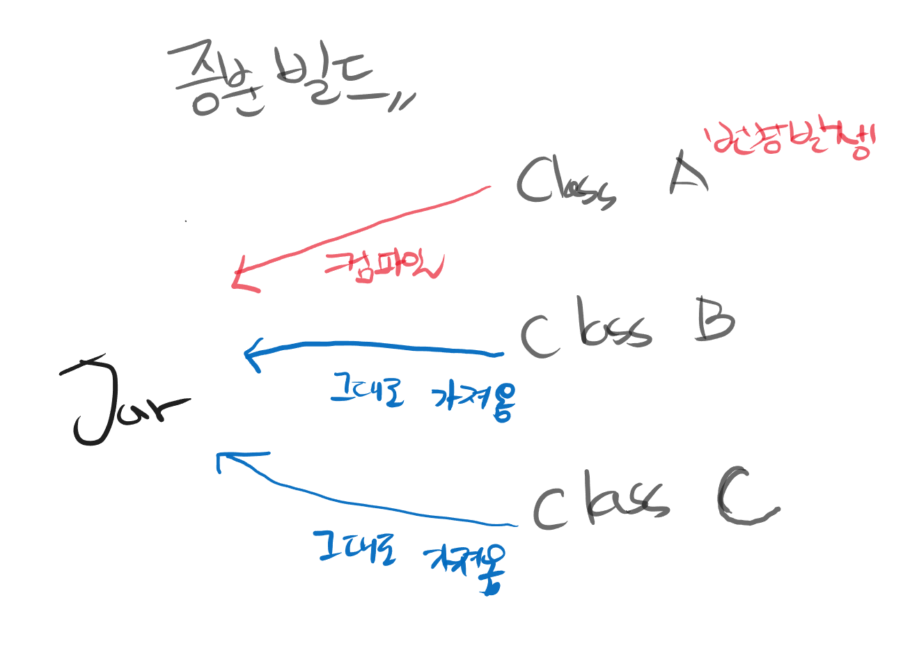 그래서 멀티모듈에서 변경이 없다면 하위모듈을 컴파일 하지 않는다는가 이런건 가능하지만 Class 하나 하나 증분처리가 안된다는 것이다.